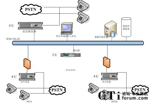 用戶需要建設(shè)一套“分布錄音,集中管理”的電話錄音系統(tǒng),在中心點有16個坐席,總計各縣有11點網(wǎng)點,每網(wǎng)點有8個坐席(項城16個)。中心和各網(wǎng)點之間用聯(lián)通的專網(wǎng)連接。用戶需要在聯(lián)通專網(wǎng)上進行數(shù)據(jù)傳輸。