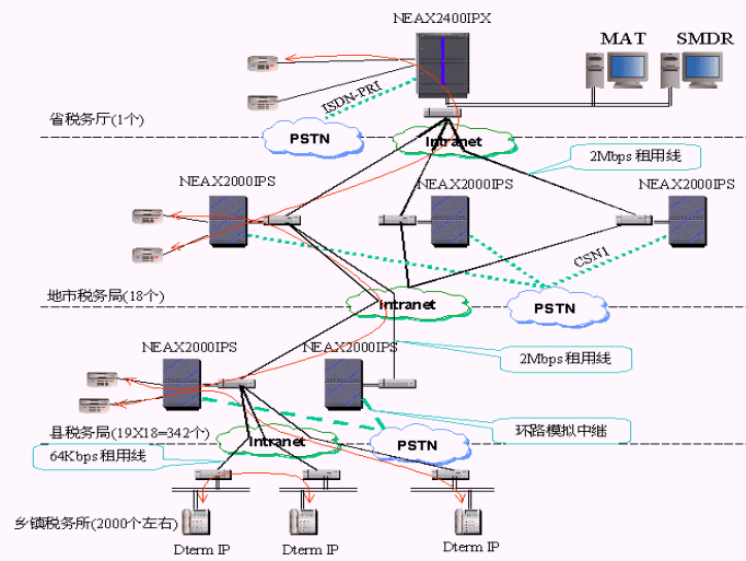 NEC公司為該省稅務(wù)提供了2003年全球同步推出的NEAX 2400及NEAX2000交換機系統(tǒng),為用戶提供了傳統(tǒng)時分交換系統(tǒng)和VoIP交換的完美結(jié)合,即具備VoIP功能又支持交換機的豐富功能,如豐富的終端,豐富的組網(wǎng)中繼和信令,語音信箱,多方會議,無線通信,統(tǒng)一計費等等。