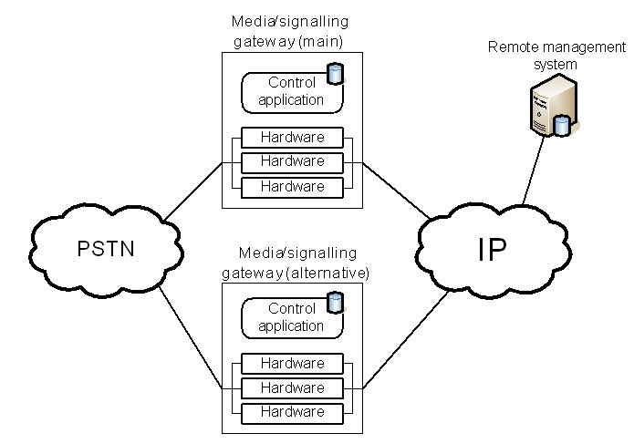 這兩種保護(hù)機(jī)制的區(qū)別可以從下面的例子進(jìn)一步闡述。該事例是一種企業(yè)IP-PSTN網(wǎng)關(guān)應(yīng)用。一般情況下,企業(yè)級(jí)的網(wǎng)關(guān)并不采用軟交換架構(gòu),所以媒體和信令網(wǎng)關(guān)功能在同一設(shè)備內(nèi)實(shí)現(xiàn)。這類網(wǎng)關(guān)是一個(gè)獨(dú)立的機(jī)架,內(nèi)裝能實(shí)現(xiàn)媒體和信令處理的硬件板卡和控制類應(yīng)用程序。此設(shè)備可以本地管理,也可以采用遠(yuǎn)程管理,如采用標(biāo)準(zhǔn)Web服務(wù)器。