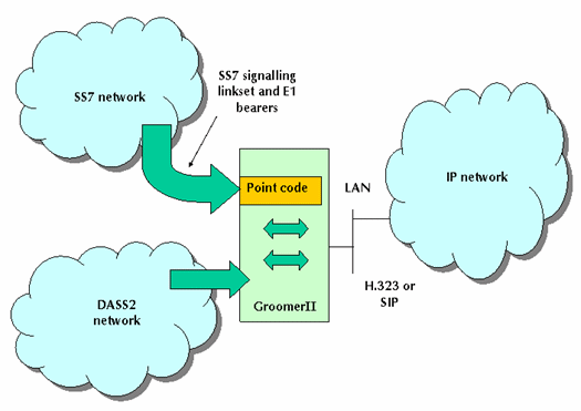 如上所述,GrommerII可以安裝不同的協(xié)議軟件。圖2中的系統(tǒng)配備了SS7和DASS2的GrommerII,擔當與IP網(wǎng)絡相連的網(wǎng)關,完成IP呼叫。
