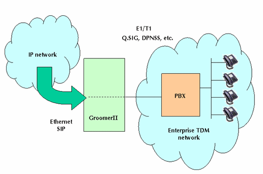 圖3的例子內,GroomerII安裝了SIP和PRI信令協(xié)議Q.SIG或DPNSS等,以網(wǎng)關的形式實現(xiàn)基于IP的網(wǎng)絡和企業(yè)PBX之間的互連設備。鑒于以往在傳統(tǒng)PBX方面的投資顯著,這種以變通的方式支持IP語音很重要,也很實際。
