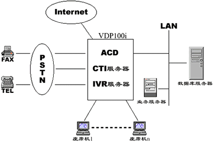 基于VDP100i構(gòu)建的CALL CENTER應(yīng)用系統(tǒng)如下圖: