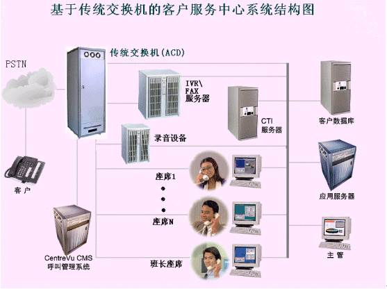 在以往大型CTI系統(tǒng)的設(shè)計(jì)中,這種模式是最常用的解決方案。傳統(tǒng)交換機(jī)由于其電信級標(biāo)準(zhǔn)的設(shè)計(jì),接入容量大、交換處理能力強(qiáng)、性能穩(wěn)定,因而往往被大、中型呼叫中心用在前端構(gòu)成ACD系統(tǒng)(自動呼叫分配系統(tǒng))用來處理排隊(duì)、路由管理、坐席管理等功能。