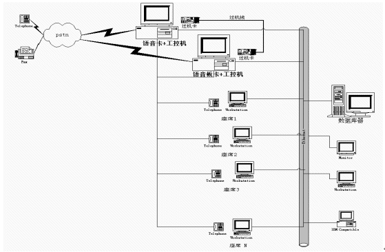 在一些小型CALL CENTER系統(tǒng)中,人們通常通過語音板卡加工控機(jī)的方式搭建系統(tǒng),通常一臺設(shè)備就集成了ACD、IVR、CTI等各種資源,各資源的使用、調(diào)派通過軟件進(jìn)行控制,有效的解決了建設(shè)成本高、系統(tǒng)構(gòu)造繁復(fù)的問題,具有相當(dāng)?shù)撵`活性。然而由于工控機(jī)和語音板卡容量有限,同時其標(biāo)準(zhǔn)最多只能是工業(yè)級標(biāo)準(zhǔn),因此在構(gòu)建相對大型的呼叫中心時就總是捉襟見肘。為了增加系統(tǒng)容量,解決多臺PC之間進(jìn)行通道交換的難題,人們又設(shè)計(jì)了過機(jī)卡和過機(jī)線來解決,其應(yīng)用系統(tǒng)如下圖: