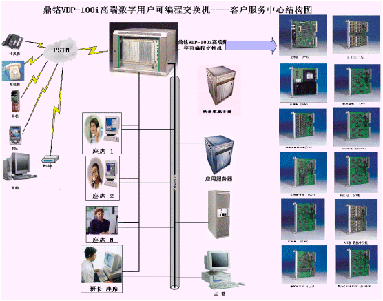 接入平臺(tái)實(shí)現(xiàn)外界接入的控制和話務(wù)交換、資源的合理分配,是構(gòu)建呼叫中心的成功關(guān)鍵所在。DM大型呼叫中心系統(tǒng)接入平臺(tái)采用鼎銘VDP-100i高端數(shù)字可編程交換機(jī),該交換機(jī)所有資源板卡都采用了高集成度、功能模塊設(shè)計(jì)思想。該接入平臺(tái)的結(jié)構(gòu)如上圖所示的右邊(詳細(xì)的功能模塊資源板請(qǐng)參閱《鼎銘高端數(shù)字可編程交換機(jī)產(chǎn)品手冊(cè)》),用戶(hù)可以根據(jù)實(shí)際情況靈活配置和增減系統(tǒng)的接入方式、資源類(lèi)型、資源數(shù)量,達(dá)到資源的充分合理利用的目的。