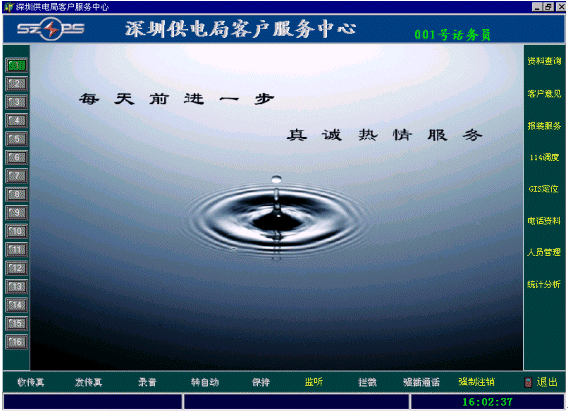 在座席的主畫面的右邊是業(yè)務(wù)功能選擇區(qū),是根據(jù)用戶實(shí)際工作的具體要求開發(fā)的。(隨后詳細(xì)介紹供電行業(yè)的業(yè)務(wù)功能模塊)