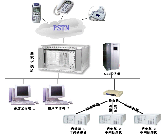 該系統(tǒng)由前端機(jī)鼎銘PBX、CTI服務(wù)器、中間處理機(jī)、座席客戶端組成(見附圖)。