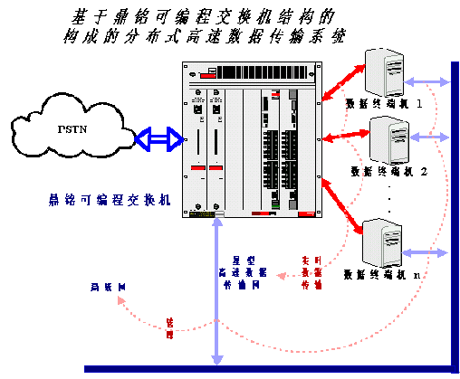 鼎銘高速數(shù)據(jù)傳輸板置于其可編程交換機(jī)內(nèi),外部可以和多臺PC或工控機(jī)相連,因為可編程交換機(jī)可以級聯(lián),所以可以和外部連接的PC或工控機(jī)理論上沒有特別限制。這樣可編程交換機(jī)的內(nèi)部I/O總線(類比于PC機(jī)的PCI或ISA總線)就不再傳輸實時數(shù)據(jù)(如語音數(shù)據(jù)),而只負(fù)責(zé)非實時性的管理和信令數(shù)據(jù),語音或其它實時數(shù)據(jù)從外部PC直接傳入可編程交換機(jī)的高速數(shù)據(jù)傳輸板,然后通過交換直接進(jìn)入外部公共電信網(wǎng)(PSTN)。