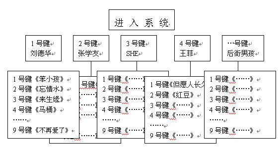 眾所周知,目前大多數(shù)電話機和手機的操作鍵盤都只有0-9十個數(shù)字鍵和*號和#號兩個符號鍵,因此在設(shè)計導航菜單的時候很受限制。比如在點歌節(jié)目中,用這些數(shù)字鍵來指代上千首歌曲是根本不可能的。以前多采用的方法有兩種:一是預先給用戶發(fā)送歌曲手冊,上面可以查到每首歌曲的代號。這種方式的缺點是實時性差,不能隨時更新歌曲庫。另外印刷宣傳資料帶來的人力和成本也不容忽視;另一種方法是將歌曲根據(jù)歌手、主題進行分類,比如下圖所列的結(jié)構(gòu):