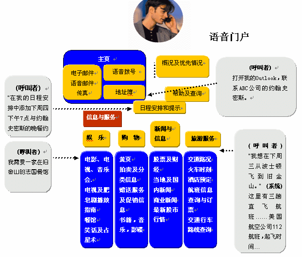 基于在語音識別技術(shù)準確度上已有突破性的進展,因此可以利用語音,不僅僅是改變原有的鍵盤輸入查詢方式,而且能夠使自動應(yīng)答系統(tǒng)處理更加復雜的情況。用戶撥打服務(wù)電話的時候,只需說出他/她的需求即可。如在電子黃頁業(yè)務(wù)中,用戶要查詢關(guān)于A公司的情況,服務(wù)電話接通以后就可以直接說出"A公司",而不要按鍵通過一層層的菜單目錄,然后系統(tǒng)就能自動播報出該單位介紹信息和聯(lián)系方式等。