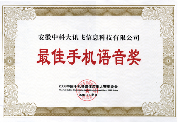 近日,首屆中國手機多媒體應用大賽組委會將“2006最佳手機語音獎”這份沉甸甸的獎牌和證書授予了科大訊飛。這一由數(shù)十位業(yè)界專家和百萬手機用戶慎重評選出的獎項,充分說明了科大訊飛在手機語音應用領域的領先地位,其分量不言而喻。