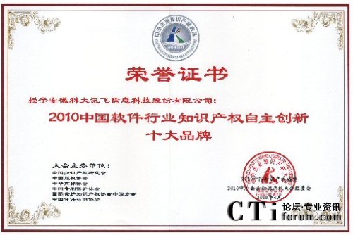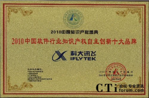 CTI論壇(ctiforum)4月29日消息(記者 潘婷婷):2010年4月25日,由中國(guó)知識(shí)產(chǎn)權(quán)研究會(huì)、中國(guó)專(zhuān)利保護(hù)協(xié)會(huì)、中國(guó)版權(quán)協(xié)會(huì)等單位聯(lián)合舉辦的“2010中外企業(yè)知識(shí)產(chǎn)權(quán)大會(huì)”在人民大會(huì)堂隆重舉行。在當(dāng)日的“2010中國(guó)知識(shí)產(chǎn)權(quán)盛典頒獎(jiǎng)典禮”中,科大訊飛憑借強(qiáng)大的自主創(chuàng)新能力以及在知識(shí)產(chǎn)權(quán)創(chuàng)造、保護(hù)與應(yīng)用方面的突出表現(xiàn)獲評(píng)“2010年中國(guó)軟件行業(yè)知識(shí)產(chǎn)權(quán)自主創(chuàng)新十大品牌”。