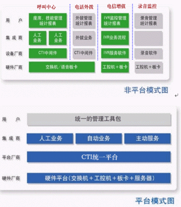 非平臺(tái)模式的系統(tǒng)建設(shè)需要采用多家設(shè)備,如不同廠家的交換機(jī)、語(yǔ)音板卡、CTI中間件、IVR服務(wù)軟件、錄音設(shè)備,以及相互獨(dú)立的、沒有統(tǒng)一設(shè)計(jì)的系統(tǒng)維護(hù)工具和業(yè)務(wù)界面。而平臺(tái)模式的系統(tǒng)建設(shè)只需要采用一家的設(shè)備,各業(yè)務(wù)模式在一個(gè)平臺(tái)上實(shí)現(xiàn),具備統(tǒng)一的管理工具。