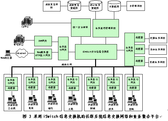 采用iSwitch安全信息交換機(jī)的社保系統(tǒng)信息交換網(wǎng)絡(luò)和業(yè)務(wù)整合平臺如圖3所示。
