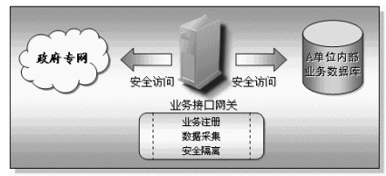 為了實(shí)現(xiàn)企業(yè)基礎(chǔ)信息交換與共享,各個(gè)接入平臺(tái)的單位必須將需要提供給其他單位的企業(yè)數(shù)據(jù)共享出來(lái),基于安全、保密等多種因素考慮,這些單位的業(yè)務(wù)數(shù)據(jù)庫(kù)不可以也不應(yīng)該對(duì)其他單位完全開(kāi)放(也就是直接連在政府專網(wǎng)上),而業(yè)務(wù)接口網(wǎng)關(guān)的作用就是將業(yè)務(wù)數(shù)據(jù)庫(kù)與政府專網(wǎng)之間的隔離、實(shí)現(xiàn)業(yè)務(wù)注冊(cè)以及數(shù)據(jù)采集等功能。業(yè)務(wù)接口網(wǎng)關(guān)的兩個(gè)網(wǎng)絡(luò)端口分別連接業(yè)務(wù)數(shù)據(jù)庫(kù)以及政府專網(wǎng),機(jī)關(guān)單位將它們業(yè)務(wù)數(shù)據(jù)庫(kù)中需要共享的業(yè)務(wù)數(shù)據(jù)項(xiàng)名稱注冊(cè)到信息中心的業(yè)務(wù)注冊(cè)庫(kù)中,其他機(jī)關(guān)單位通過(guò)查詢業(yè)務(wù)注冊(cè)庫(kù)獲取對(duì)方單位的業(yè)務(wù)注冊(cè)信息,并通過(guò)自己的業(yè)務(wù)接口網(wǎng)關(guān)向信息交換機(jī)發(fā)出業(yè)務(wù)數(shù)據(jù)采集的要求,信息交換機(jī)接收請(qǐng)求后對(duì)請(qǐng)求進(jìn)行校驗(yàn),校驗(yàn)通過(guò)后信息交換機(jī)會(huì)通過(guò)被采集業(yè)務(wù)數(shù)據(jù)庫(kù)所在單位的業(yè)務(wù)接口網(wǎng)關(guān)獲取業(yè)務(wù)數(shù)據(jù),數(shù)據(jù)通過(guò)信息交換機(jī)交換到采集單位的業(yè)務(wù)接口網(wǎng)關(guān),此時(shí)采集單位可以將數(shù)據(jù)保存在己方的采集數(shù)據(jù)庫(kù)中,或者直接由應(yīng)用系統(tǒng)使用。