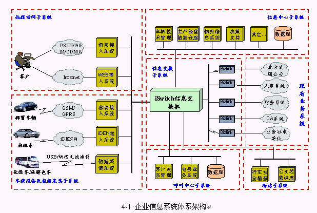 項(xiàng)目的建設(shè)內(nèi)容包括兩個內(nèi)容:一是建立以出租車電召為主的車輛監(jiān)控調(diào)度服務(wù)和管理系統(tǒng),即建立客服中心;二是建立一個統(tǒng)一的企業(yè)信息平臺,整合現(xiàn)有業(yè)務(wù)系統(tǒng),即信息中心。在此基礎(chǔ)上優(yōu)化和重整企業(yè)內(nèi)部的業(yè)務(wù)流程,提升企業(yè)運(yùn)作效率和服務(wù)水平。