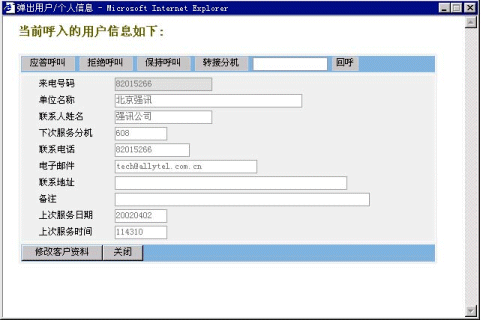 4、來電顯示:當(dāng)有外線電話撥入坐席,坐席電話振鈴的同時(shí),會(huì)在顯示器上彈出新窗口顯示來電用戶的信息;