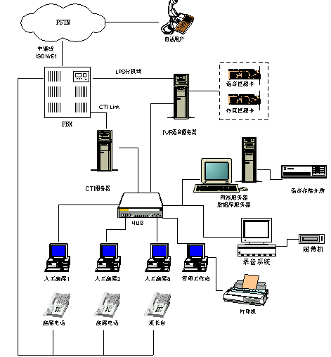 Server)是呼叫中心的核心部件,它通過交換機(jī)的CTI Link獲取交換機(jī)的狀態(tài)并實現(xiàn)對交換機(jī)的通信。它是一個將計算機(jī)網(wǎng)絡(luò)與電話網(wǎng)緊密聯(lián)系的紐帶。CTI服務(wù)器部份包括CTI服務(wù)器(工控機(jī)/服務(wù)器)、UltraCTI呼叫控制模塊、CallMonitor呼叫管理/監(jiān)控/統(tǒng)計模塊、UltraCDR呼叫數(shù)據(jù)記錄模塊。