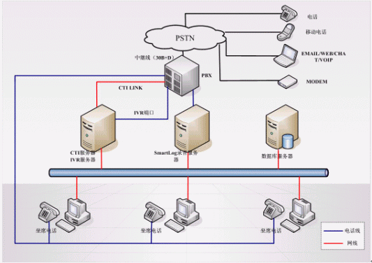 呼叫中心前端通信平臺,主要由SIEMENS HiPath系列交換機,計算機電話集成服務(wù)器(UltraCTI),交互式語音應(yīng)答服務(wù)器(ctsIVR),在線錄音監(jiān)聽服務(wù)器(SmartLog),數(shù)據(jù)庫服務(wù)器,MCI服務(wù)器以及傳真服務(wù)器幾個部分組成。中繼線多采用30B+D或2B+D接入。