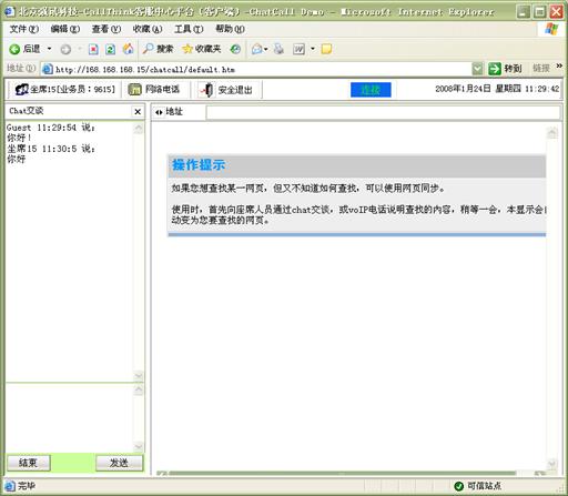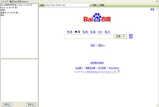 網(wǎng)頁(yè)同步:客戶(hù)在通過(guò)"客服代表回復(fù)"、"互聯(lián)網(wǎng)電話"、"文字交談"等方式與客服代表進(jìn)行實(shí)時(shí)交流時(shí),還可以通過(guò)網(wǎng)頁(yè)同步功能,與客戶(hù)代表的瀏覽器進(jìn)行同步。這樣,客戶(hù)與客戶(hù)代表看到的是同一網(wǎng)頁(yè),由客戶(hù)代表引導(dǎo)客戶(hù)對(duì)網(wǎng)頁(yè)進(jìn)行瀏覽,找到所需要的信息。網(wǎng)頁(yè)同步功能適用于不同的實(shí)時(shí)交流方式,可以大大提高客戶(hù)服務(wù)的效率和質(zhì)量。如圖14、15所示: