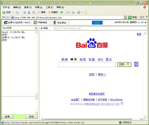 Chart交談:客戶(hù)可以選擇通過(guò)WEB頁(yè)面與座席通過(guò)文字的形式進(jìn)行交談,無(wú)需語(yǔ)音通信 ,客戶(hù)進(jìn)入特定的CHAT網(wǎng)頁(yè)后,可以選擇一個(gè)座席或一組座席進(jìn)行CHAT交談。如圖12和13所示:
