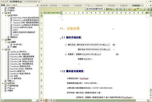 業(yè)務(wù)知識(shí)庫(kù)系統(tǒng)包括大量的信息,它可以幫助坐席人員精確、及時(shí)地得到相關(guān)知識(shí)的詳細(xì)信息。坐席人員可以利用業(yè)務(wù)知識(shí)庫(kù)系統(tǒng)提供的多種查詢(xún)手段,進(jìn)行各種信息的查詢(xún)。管理人員還可以通過(guò)知識(shí)庫(kù)訪問(wèn)量統(tǒng)計(jì)來(lái)了解座席員訪問(wèn)知識(shí)庫(kù)的情況,并且可以通過(guò)知識(shí)庫(kù)資料維護(hù)來(lái)靈活定制知識(shí)庫(kù)的內(nèi)容。