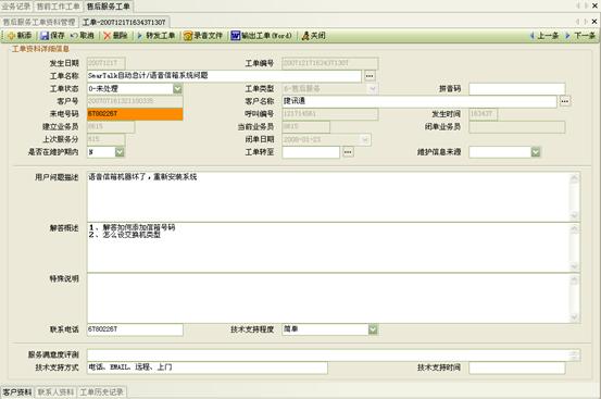 3) 工作流閉環(huán)、客戶(hù)通話歷史,客戶(hù)聯(lián)系歷史,工單流轉(zhuǎn):工作流系統(tǒng)是通過(guò)工單實(shí)現(xiàn)各工作流環(huán)節(jié)的聯(lián)系以及工作流的定義管理,工作流狀態(tài)查詢(xún)、更改的。操作員可根據(jù)用戶(hù)的不同業(yè)務(wù)請(qǐng)求,建立相應(yīng)的工單記錄,并對(duì)該事后處理過(guò)程進(jìn)行跟蹤;也可對(duì)要處理的事務(wù)形成工單轉(zhuǎn)給相應(yīng)的操作員,并跟蹤該工單的處理過(guò)程;可定期提示操作員處理要過(guò)期的工單,以提高服務(wù)質(zhì)量;每次處理過(guò)程都會(huì)有詳細(xì)的記錄,以便統(tǒng)計(jì)查詢(xún) 。如圖8、9、10: