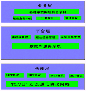 3、 傳輸層:主要完成與聯(lián)通、移動(dòng)和網(wǎng)通等公司的網(wǎng)絡(luò)傳輸,本系統(tǒng)支持多種傳輸協(xié)議,SMPP協(xié)議,CMPP協(xié)議、SGIP協(xié)議和SMGP協(xié)議。
