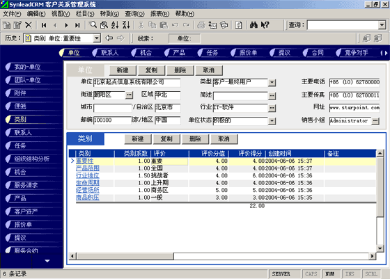 客戶單位的分類較聯(lián)系人的分類更復(fù)雜。常用的分類有:按照企業(yè)規(guī)模來(lái)分類(大、中、小,層次自定義,下同)、按照該客戶與本單位的緊密程度分類(緊密、普通、疏遠(yuǎn))、按照該客戶的重要性分類(重要、普通、次要)、按照該客戶的忠誠(chéng)度分類(忠誠(chéng)、普通、游移)。有一些用戶企業(yè),希望對(duì)客戶單位特征進(jìn)行采集,進(jìn)而進(jìn)行客戶信用評(píng)價(jià)。信用特征的類別可以多達(dá)數(shù)十種類(詳細(xì)情況可參考有關(guān)書籍)。利用SynleadCRM,您可以為每個(gè)類指定系數(shù),為類下屬的每個(gè)評(píng)價(jià)指定評(píng)分分值。例如,您可以建立一個(gè)類別為"客戶倉(cāng)庫(kù)積壓商品的情況",系數(shù)為1,該類別下屬的評(píng)價(jià)有"很多1分"、"一般3分"、"少1分"、"未知0分",如果指定某客戶該類別的評(píng)價(jià)為一般,則該項(xiàng)目得分為3分*1(系數(shù))=3分。依此類推,您還可以指定更多的分類與評(píng)價(jià),例如:客戶經(jīng)營(yíng)場(chǎng)所所處的位置、客戶在企業(yè)生命周期中所處的位置、客戶在行業(yè)中的地位、客戶產(chǎn)品的組合情況、客戶產(chǎn)品覆蓋的市場(chǎng)范圍、客戶產(chǎn)品的淡旺季規(guī)律、客戶近年?duì)I業(yè)額的增減趨勢(shì)、客戶的年度營(yíng)業(yè)額、客戶的現(xiàn)金周轉(zhuǎn)能力、客戶的負(fù)債情況、客戶是否涉及中大訴訟等。每一個(gè)類別項(xiàng)目的評(píng)分經(jīng)過系數(shù)的加權(quán)運(yùn)算后,可以求和,得到這個(gè)客戶的總評(píng)分。未來(lái)也可以利用分析模型對(duì)此類數(shù)據(jù)進(jìn)行進(jìn)一步的分析,提供輔助決策所需要的圖表和報(bào)表。