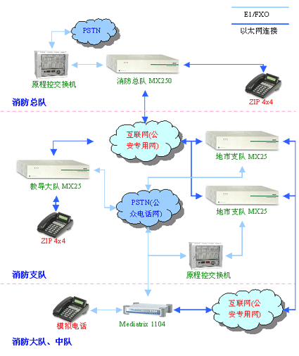整個系統(tǒng)主要由Zultys MX250交換機、ZIP 4x4話機、ZIP 4x5話機構(gòu)成。MX250交換機擁有傳統(tǒng)電話交換機(PBX/PABX)的全部功能,可以真正把消防通信的數(shù)據(jù)網(wǎng)絡(luò)和電話網(wǎng)絡(luò)融為一體,實現(xiàn)基于IP的語音通訊。