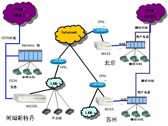 在阿姆斯特丹配置一臺MX250交換機(jī),通過ISND連接原有交換機(jī)及丹麥PSTN網(wǎng)絡(luò),北京安裝一臺MX25網(wǎng)關(guān)與原有集團(tuán)電話互聯(lián),蘇州安裝一臺MX25與原有呼叫中心互聯(lián),三點(diǎn)通過基于Internet的VPN組成專用VOIP網(wǎng)。
