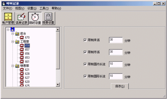 當(dāng)前,商路通實(shí)時(shí)計(jì)費(fèi)系統(tǒng)可以根據(jù)每一個(gè)分機(jī)、話務(wù)類型進(jìn)行實(shí)時(shí)控制?梢葬槍(duì)每一種話務(wù)類型(來話、市話、國(guó)內(nèi)長(zhǎng)途、國(guó)際長(zhǎng)途)設(shè)置不同的通話時(shí)長(zhǎng)限制,時(shí)間一到立刻拆掉。