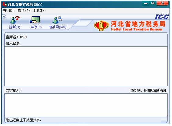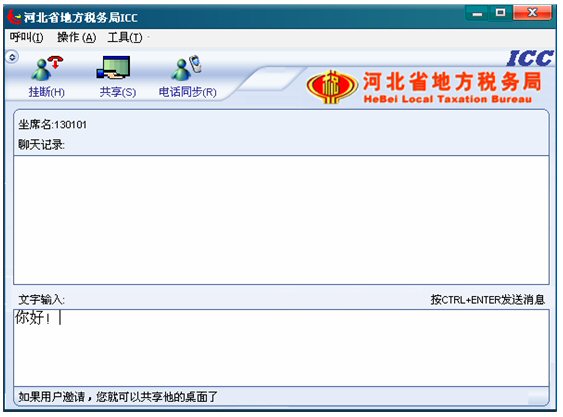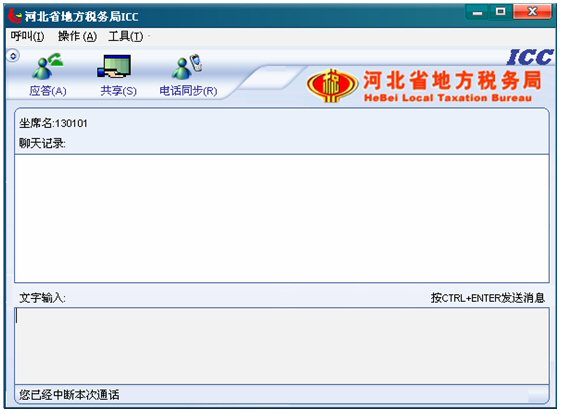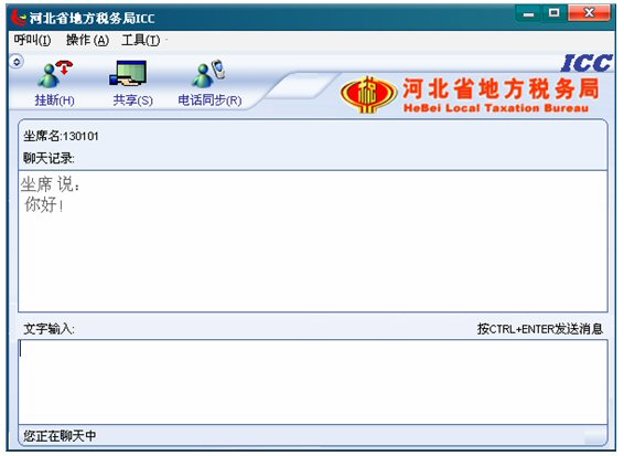 輸入文字信息后按CTRL+ENTER就可發(fā)送消息。輸入的文字可以在 ICC界面上面的聊天記錄對(duì)話框中顯示,同時(shí)發(fā)送給納稅人。如下圖: