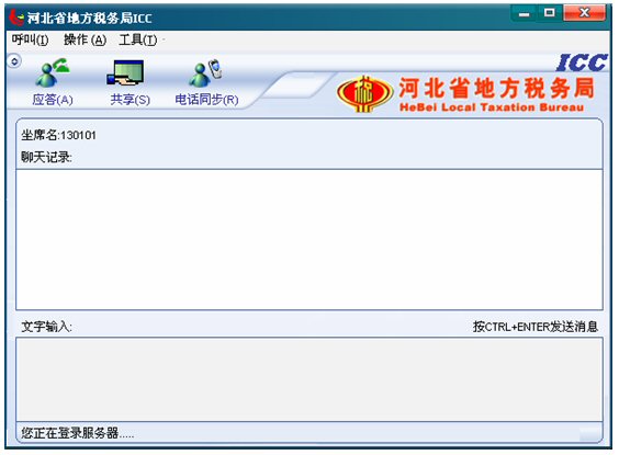 2. 點(diǎn)擊12366界面下面一行按鈕中的ICC按鈕,運(yùn)行起來ICC。出現(xiàn)ICC界面,此時(shí)ICC處于登錄服務(wù)器狀態(tài),左下角的狀態(tài)欄有文字提示“您正在登錄服務(wù)器……”。聊天記錄對(duì)話框的上面有坐席名,例如“坐席名:130101”如下圖: