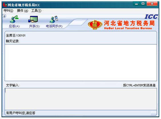 5. 點(diǎn)擊應(yīng)答按鈕后,應(yīng)答按鈕變?yōu)閽鞌喟粹o,并且左下角的狀態(tài)欄文字提示首先變?yōu)椤澳F(xiàn)在可以與對(duì)方進(jìn)行文本交談了”,從現(xiàn)在開始到坐席掛斷呼叫期間,坐席就可以和納稅人進(jìn)行文本交談了。