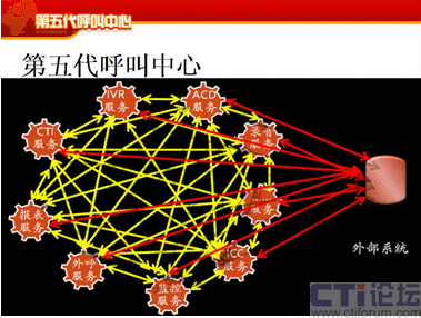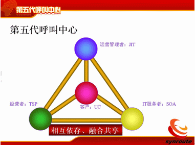 這幾方面相互制約,相互影響,相互關聯(lián),這是我們提的相互依存,融合共享,這是它的核心,這幾個方面相互作用。今天短暫的時間也只能講到IT服務者通過SOA在第五代呼叫中心如何支持其它方面的要求。