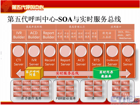 IBM、微軟、BEA、朗訊、AVAYA、甲骨文等等都開始去支持SOA,SOA被公認為解決當前解決軟件聚合的有效方式,其中一個重要的概念就是ESB,再強調一下ESB是企業(yè)服務總線。僅有SOA是不夠的,因為ESB它的典型特征是面向WEB非實時的系統(tǒng),這個非實時的系統(tǒng),呼叫中心的實時要求太高了,一個電話來了以后,做屏幕彈出的時候,你需要一秒鐘之內(nèi)屏幕彈出來;如果非實時的,就要五秒、十秒,這個是接受不了,接著說現(xiàn)場管理和座席的自我管理也是不允許的,現(xiàn)在要實時看到座席的占有率,看到排隊情況,看呼損這些指標,可是光單純地用ESB是解決不了,所以我們就提出了實時服務總線。