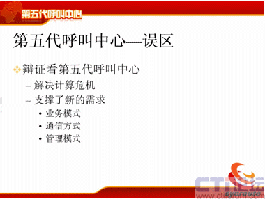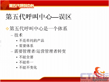 下面我提第五代呼叫中心的誤區(qū),首先我們要辯證地看第五代呼叫中心,剛才好像我在解決問題,這個呼叫中心的計算危機產(chǎn)生了,我在解決計算危機的問題,但是大家要反著想,我把這個問題解決了,我按這種方式去架構了,這時候它的業(yè)務模式就能支持到非常豐富了,而以前的業(yè)務模式,業(yè)務的創(chuàng)造為什么進行不下去?我們不能說全部都是因為IT系統(tǒng),但是IT系統(tǒng)占很大的一個部分,其實就是因為投資的部分,如果你有足夠錢的話,可以實現(xiàn)足夠的想法。第二個方面通信方式也是一樣,通信方式也是你可以支持更多的通信方式,你可以將3G的視頻加上去,你可以將很多業(yè)務加進去,你可以把固定點報警加上去,你可以把IPTV的業(yè)務方式加上去,管理模式也一樣,你可以不斷地調整,這個調整只要是在框架一定范圍內(nèi)不斷地調整都可以支持,那么對于運營管理也能同樣進行有效的支持。