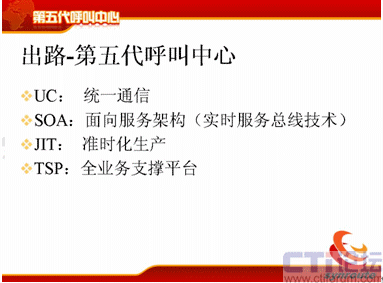 迎接第五代呼叫中心的挑戰(zhàn),重申一下,第五代呼叫中心的四個特性:UC統(tǒng)一通信的;SOA面向服務架構和實時服務總線技術;JIT的準時化生產(chǎn);TSP全業(yè)務平臺。