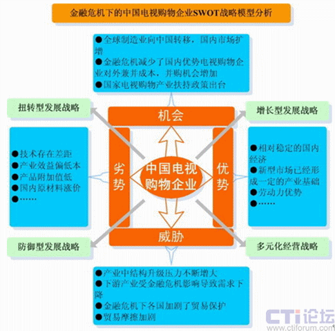 1992年至2009年以來,電視購物經歷了從割據到統一,全國購物頻道網絡化;從粗放到科學,頻道運營模式專業(yè)化;從簡介到深度,頻道編排方式規(guī)律化、從滯后到及時,物流配送體系成熟化。電視購物被譽為繼零售、超市之后的第三次銷售革命,電視購物將成為金融危機經濟形態(tài)下未來中國電視新的經濟增長點,而付費電視、數字網絡電視的發(fā)展,是中國電視購物市場新的戰(zhàn)略機會。金融危機下的中國電視購物企業(yè)SWOT戰(zhàn)略模型分析如下: