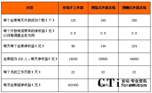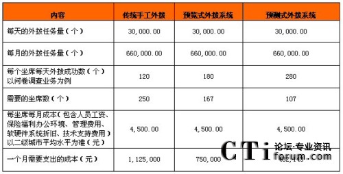 從上表可以看出,在同等每天3萬(wàn)個(gè)呼叫任務(wù)的情況下,由于使用預(yù)測(cè)式外撥系統(tǒng)使得效率提升,所需人員數(shù)比預(yù)覽式外撥方式少用60人,比傳統(tǒng)手工外撥人員數(shù)量減少一半多,省的費(fèi)用也相當(dāng)可觀。
