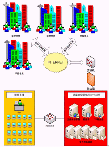 1. 利用該平臺(tái)將網(wǎng)絡(luò)學(xué)院的教學(xué)現(xiàn)場(chǎng)發(fā)布到Internet網(wǎng)上,讓所有網(wǎng)絡(luò)學(xué)院學(xué)生可以通過(guò)網(wǎng)絡(luò)來(lái)進(jìn)行學(xué)習(xí),形成一個(gè)大型的網(wǎng)絡(luò)教學(xué)平臺(tái)。