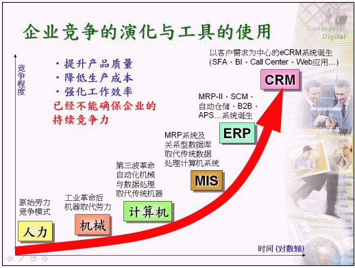 如此龐大的系統(tǒng)以信息技術(shù)角度來看,確實已經(jīng)涵蓋了企業(yè)日常營運作業(yè)的6、7成以上,因此,很多企業(yè)的主管甚或MIS主管認(rèn)為建置了ERP系統(tǒng)之后其實就已經(jīng)作好企業(yè)e化的工作了,其實仔細(xì)思考之后您會發(fā)覺ERP系統(tǒng)還是有其功能限制之處,以業(yè)務(wù)單位之銷售工作推展為例,所能享受到的e化成果真是少之又少,許多業(yè)務(wù)人員平日最常運用到ERP系統(tǒng)大都為訂單管理部份,只有少部份的業(yè)務(wù)人員同時會運用到ERP系統(tǒng)中之報價功能,尤其ERP系統(tǒng)對業(yè)務(wù)人員在開發(fā)潛在客戶或作好案例管理方面之應(yīng)用更是幫助有限。