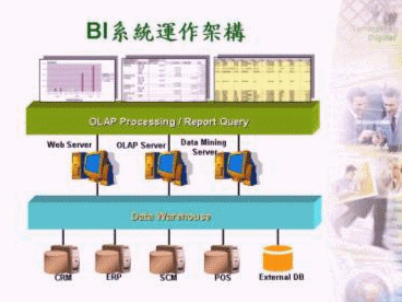 BI(Business Intelligence)即商業(yè)智慧,它是將企業(yè)內(nèi)部各系統(tǒng)(如:CRM、ERP、SCM、POS等)之異質(zhì)數(shù)據(jù)庫作一匯整,然后再加以整理、分析成有用的信息,以提供決策者作為企業(yè)經(jīng)營管理之參考。