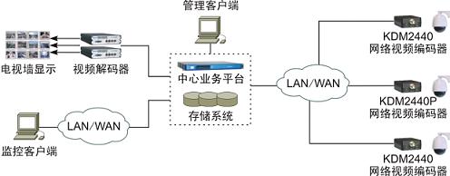 KDM2440/2440P可作為網(wǎng)絡視頻監(jiān)控系統(tǒng)的智能化前端接入單元,與攝像機一起實現(xiàn)監(jiān)控點的集成化部署,攝像機采集的模擬視頻信號經(jīng)編碼處理后以IP碼流形式上傳至中心業(yè)務平臺,在監(jiān)控客戶端的管理和控制下,中心業(yè)務平臺將上傳的碼流按需轉發(fā)到監(jiān)控客戶端、視頻解碼器以及網(wǎng)絡錄像單元,分別實現(xiàn)PC瀏覽、電視墻顯示以及錄像存儲。