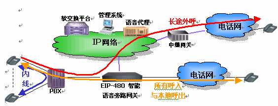 EIP-480設(shè)備處于企業(yè)PBX(電話交換機(jī))和PSTN(固定電話網(wǎng))之間。它具有呼叫智能選路功能,支持通過判斷被叫號(hào)碼,自動(dòng)將異地企業(yè)間或外部長(zhǎng)途電話旁路到IP網(wǎng)絡(luò)上。