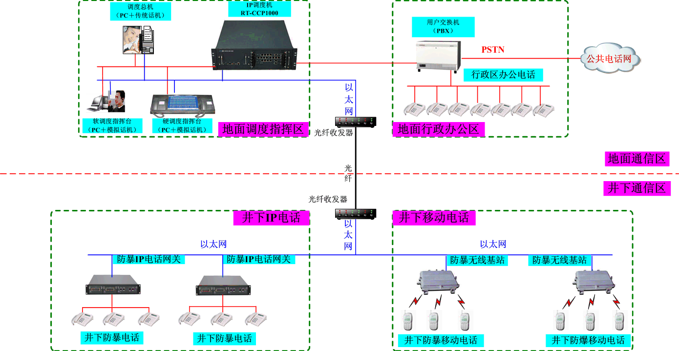 在傳統(tǒng)調(diào)度技術(shù)基礎(chǔ)上完美的將固話網(wǎng)絡(luò)、IP網(wǎng)絡(luò)、無線網(wǎng)絡(luò)充分融合,可以實(shí)現(xiàn)井上調(diào)度指揮區(qū)及井上行政辦公區(qū)、井下IP電話及井下移動電話的互通,也能提供接口與原有的行政辦公電話無縫整合。同時也完美的解決了不同網(wǎng)絡(luò)之間、多套系統(tǒng)之間存在兼容性差、共享性差、重復(fù)投資、操作復(fù)雜等諸多缺陷。
