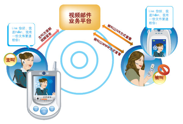 視頻郵件業(yè)務(wù)是在原有的語音郵件的基礎(chǔ)上又增加了極具個性化的視頻功能。即當被呼叫方忙、在3G信號覆蓋區(qū)以外或是無法接聽時可以使用視頻郵件的功能。當一個通話呼叫被切換到視頻郵件服務(wù)后,呼叫方首先將會看到一段視頻的歡迎信息,這可以是通過視頻片的方式預(yù)先錄制的個性化的視頻信息,也可以是預(yù)先設(shè)定的一個卡通形象。呼叫方可以錄下個人的視頻通話通過郵件方式傳遞給被叫。