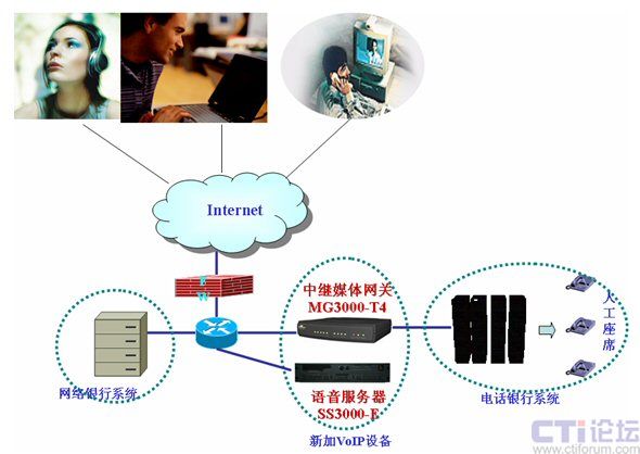 提高安全性,平臺位于防火墻后,不設(shè)公網(wǎng)地址:眾所周知,VoIP的通話必須要有一個(gè)在公網(wǎng)上的平臺來控制。但由于銀行方面的安全性要求,軟交換平臺必須位于防火墻之后,并且不能配置真實(shí)的公網(wǎng)IP。為了適應(yīng)此要求,高鴻公司的軟交換平臺支持NAT后的工作模式。