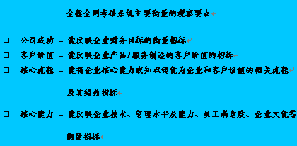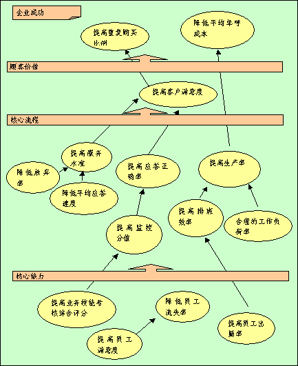 全程全網(wǎng)考核策略目標因果關(guān)系圖是"平衡計分卡"應用的重要環(huán)節(jié),在此要特別強調(diào)?因為它是將根據(jù)公司遠景規(guī)劃以及使命確定的四個考核維度轉(zhuǎn)化為全程全網(wǎng)考核系統(tǒng)進入實際操作階段之關(guān)鍵步驟。在平衡記分卡的設計過程中,它起著承前啟后的作用,在構(gòu)建呼叫中心全程全網(wǎng)考核系統(tǒng)中全程全網(wǎng)考核策略目標因果關(guān)系圖的突破性銜接功能-以其邏輯性的架構(gòu)來界定和描述實現(xiàn)全面績效考核的策略方案。將公司成功、客戶價值、核心流程和呼叫中心核心能力之間的關(guān)聯(lián)清晰地呈現(xiàn),并將企業(yè)的策略與其績效衡量系統(tǒng)相銜接。